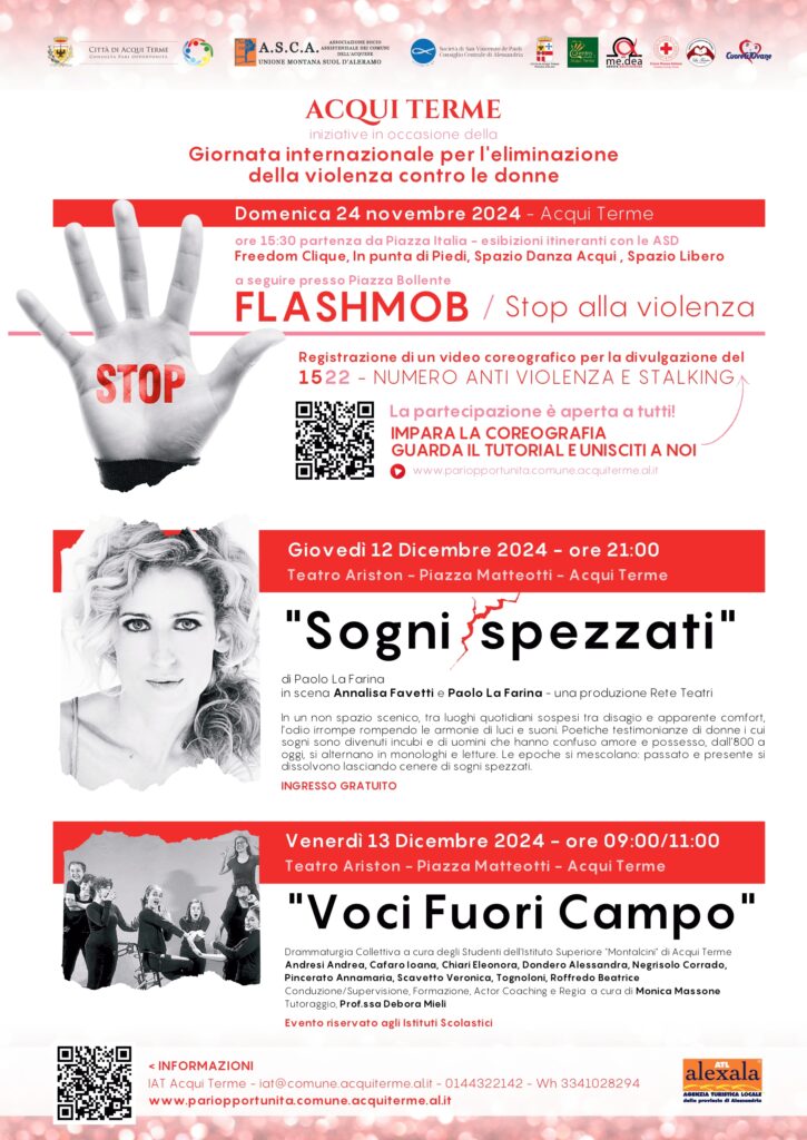 Le iniziative sono state aperte ieri  domenica 24 novembre p.v. con un flash mob itinerante per le piazze e vie cittadine in collaborazione con le scuole di danza e di ginnastica artistica acquesi. Alle ore 15,30 partendo dalla Piazza Italia,  le esibizioni itineranti di ASD Freedom Clique, Spazio Libero, In punta di Piedi che si sono culminate in Piazza Bollente per un momento di commemorazione delle vittime e registrazione di un video coreografico per la condivisione del messaggio “Stop alla violenza”. con la partecipazione di tutti.